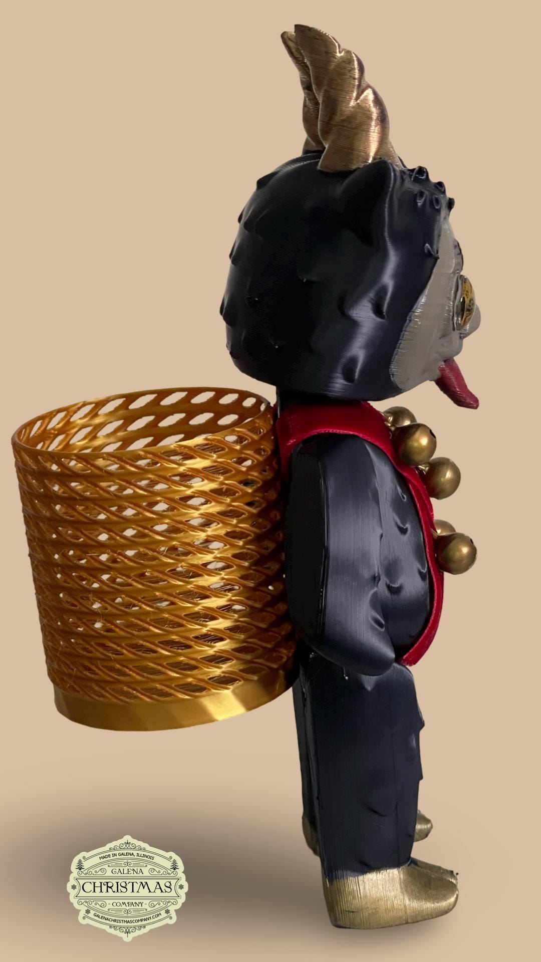 With gleaming gold horns, a sinister little smirk, and a basket that’s definitely not for fruit, Lil’ Krampus isn’t here to make sure you behave—he’s here to keep things “interesting”. And let’s just say, he’s got strong feelings about holiday “helpers” who snitch.