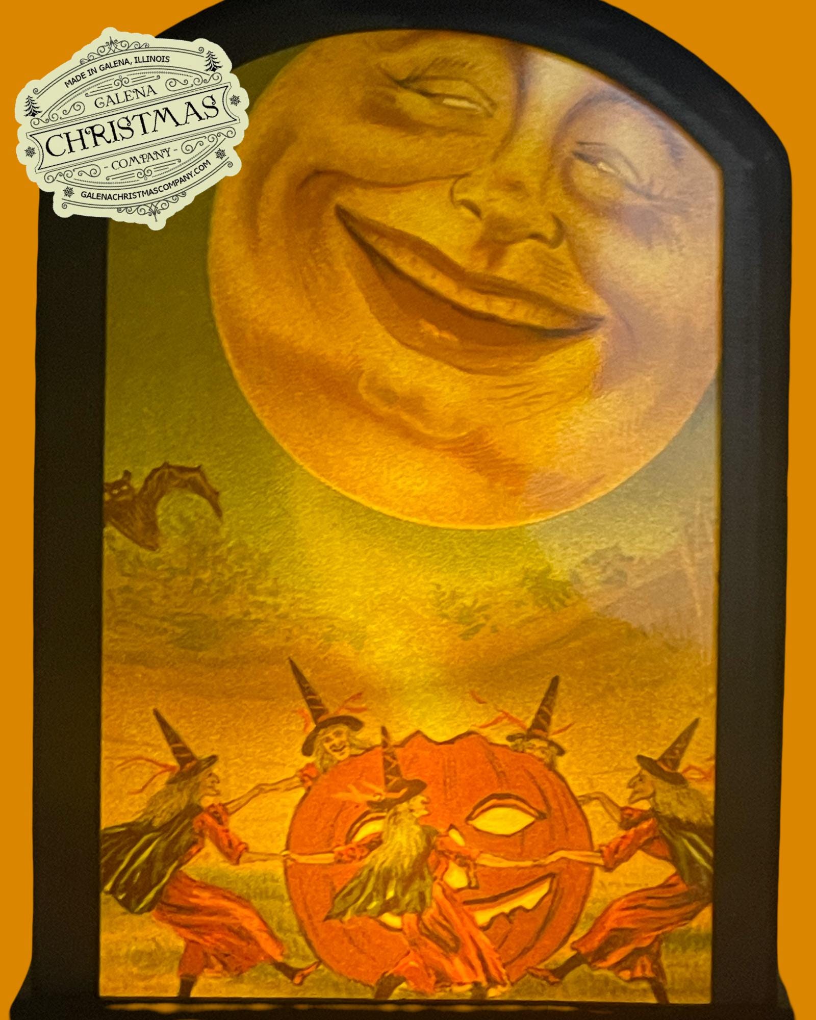 I love this thing! I've always been fascinated with full moons with smiling faces and the witches dancing are over the top. Can be hung as a mini lantern or placed anywhere you need a fun accent! You need this thing.