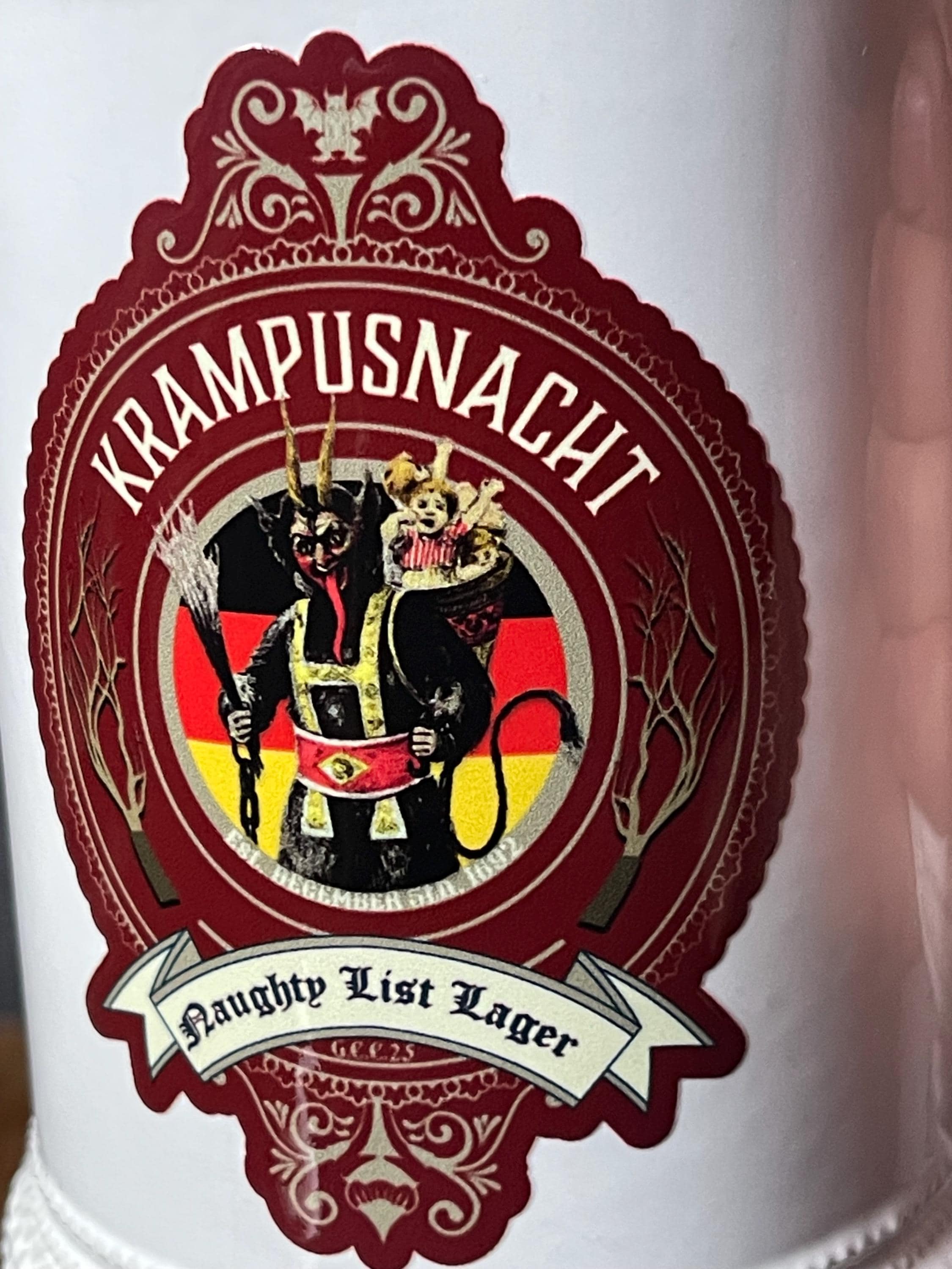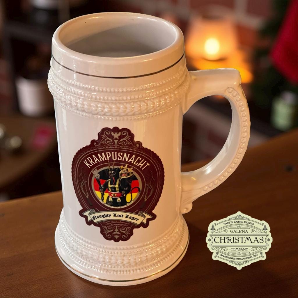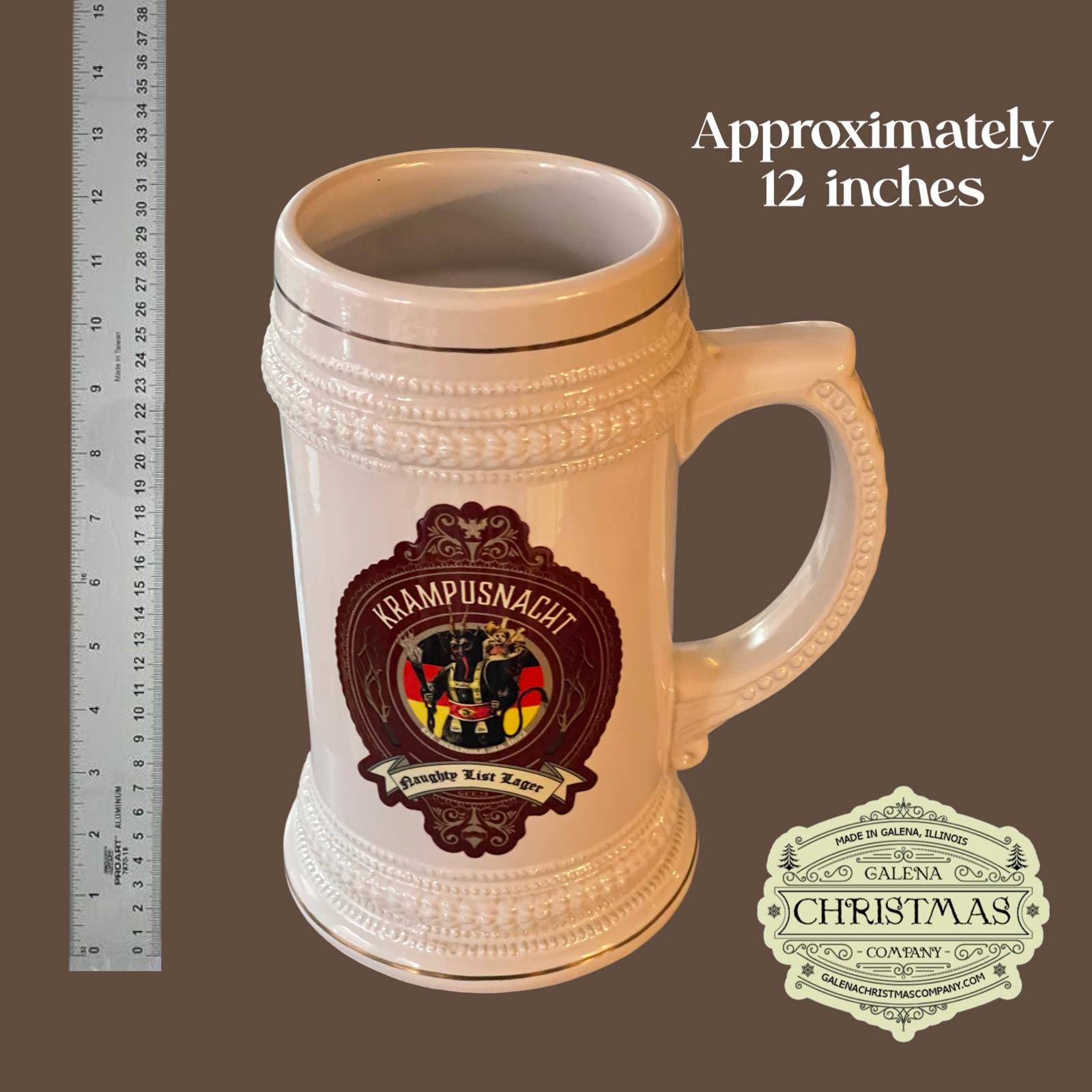 The rich navy and gold label reads “KRAMPUSNACHT” and “Naughty List Lager,” making it a standout piece for seasonal sipping or year-round storytelling. Whether you’re hosting a haunted holiday party or gifting your favorite beer enthusiast, this stein delivers both charm and chills.