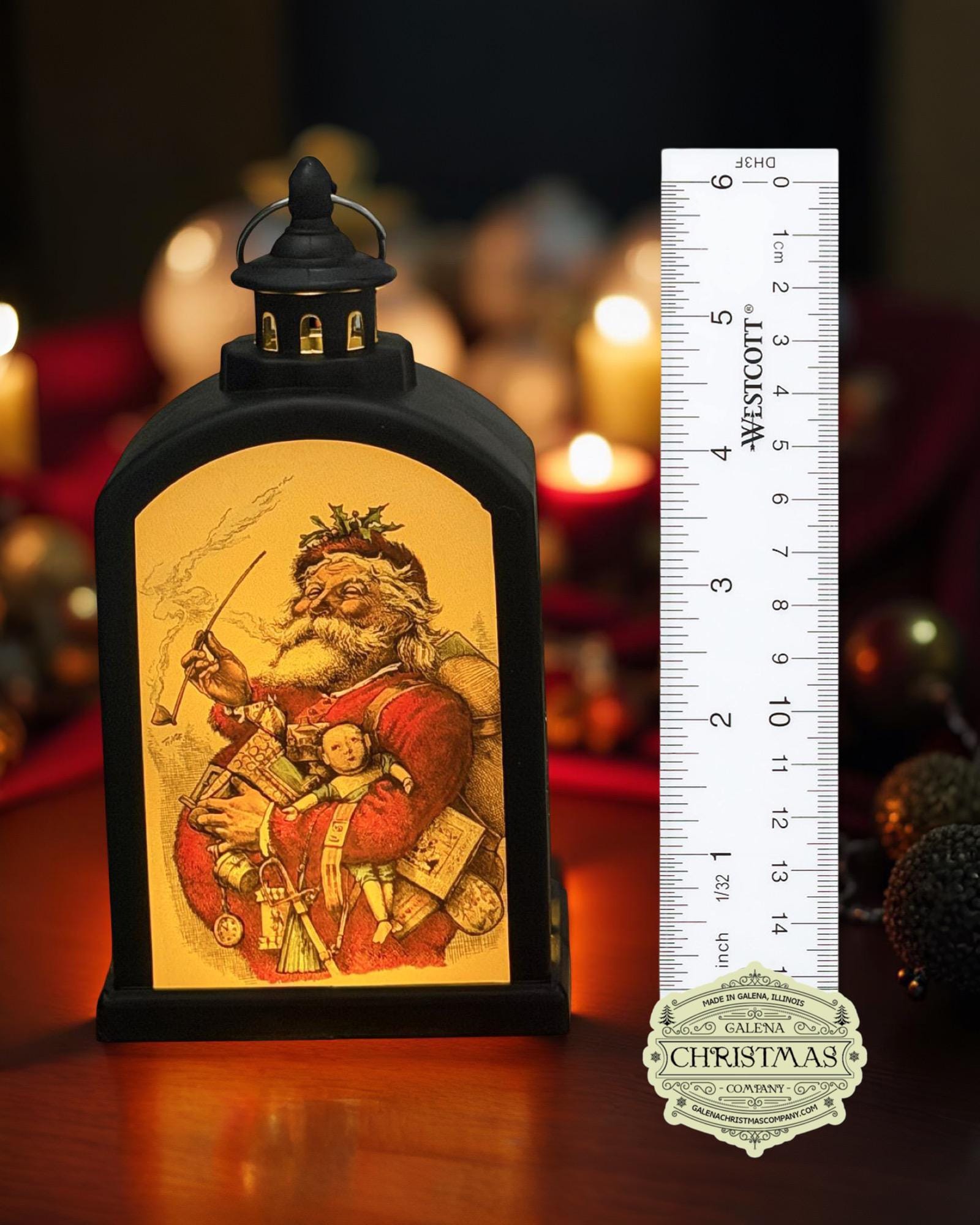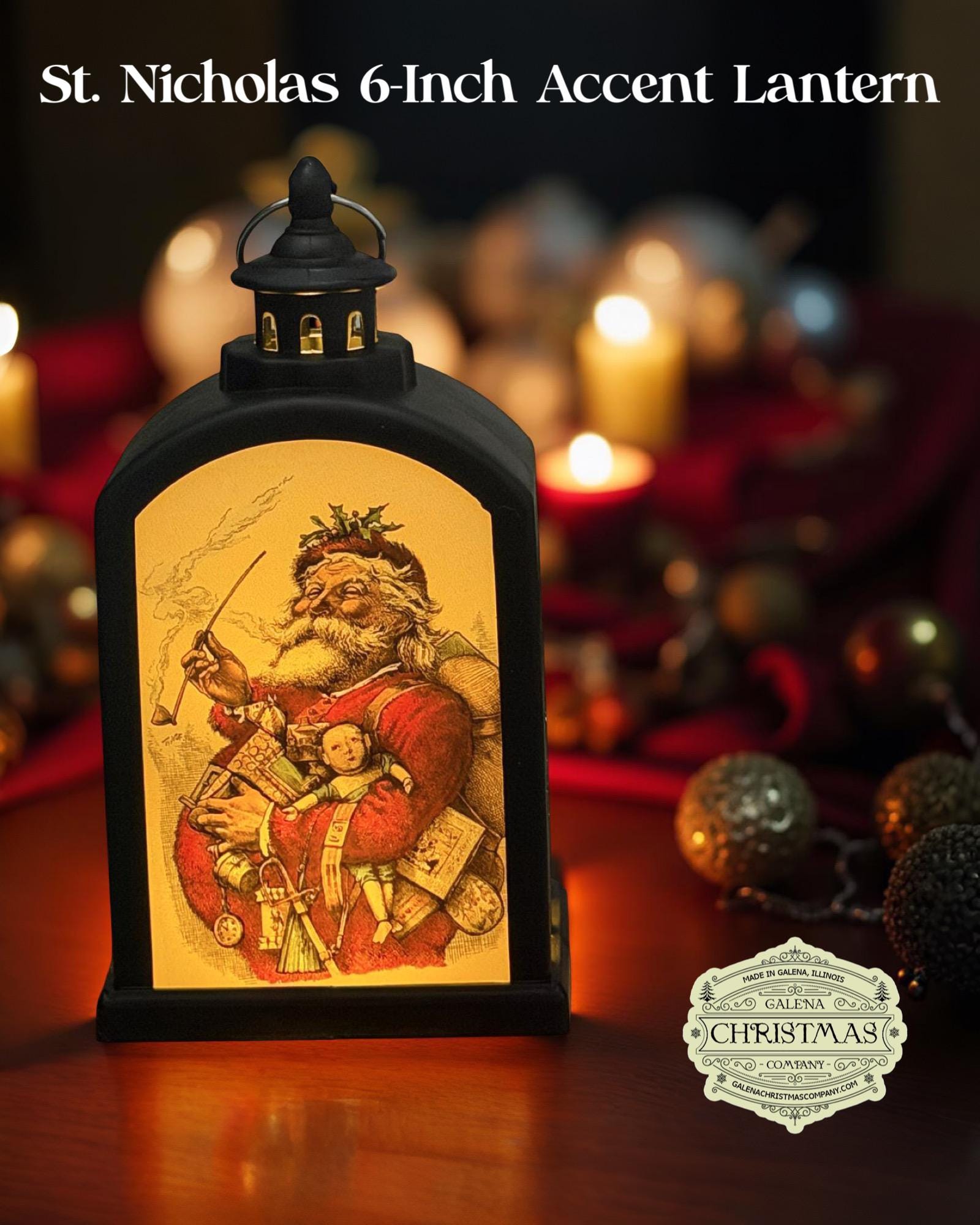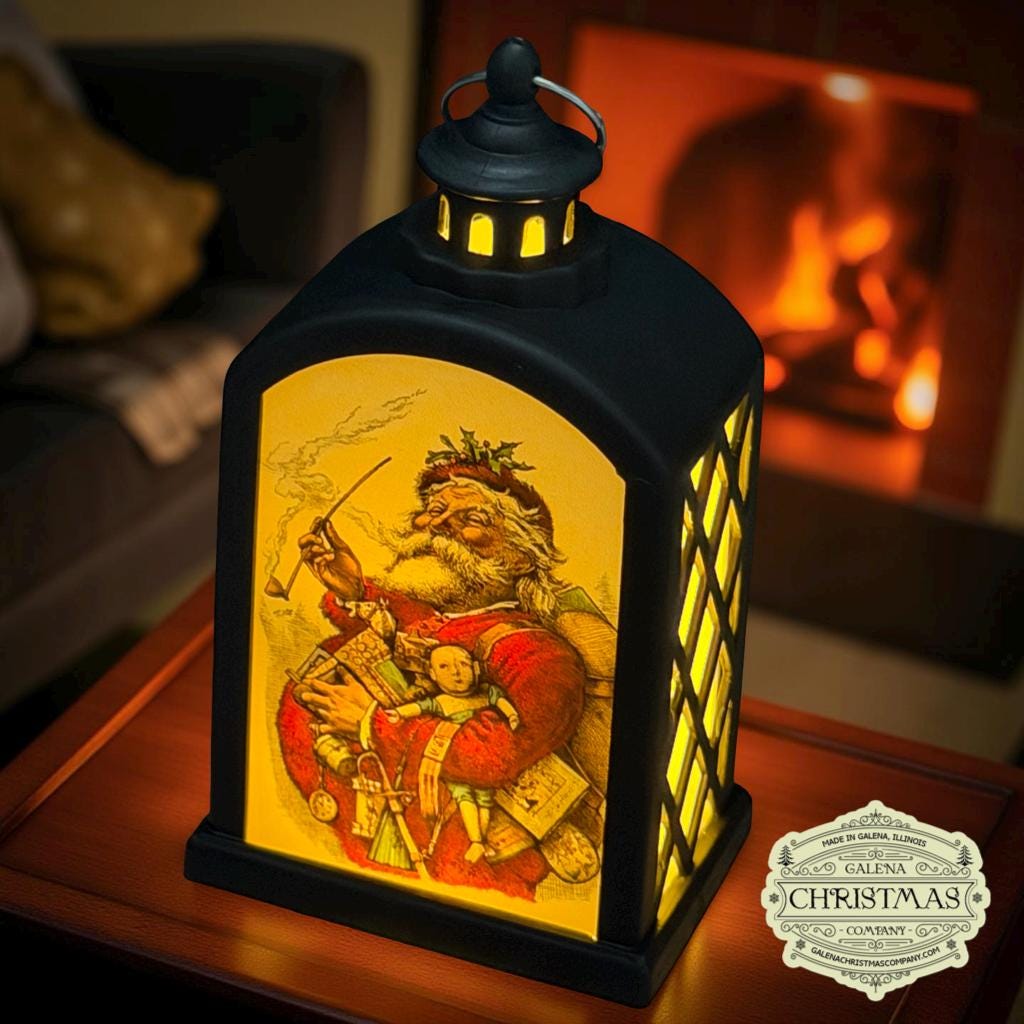 Step into the nostalgic glow of Galena Christmas Company with our exclusive St. Nicholas Lantern. This 6-inch LED lantern celebrates the warmth, generosity, and timeless magic of Christmas through the eyes of America’s most beloved illustrator—Thomas Nast.
